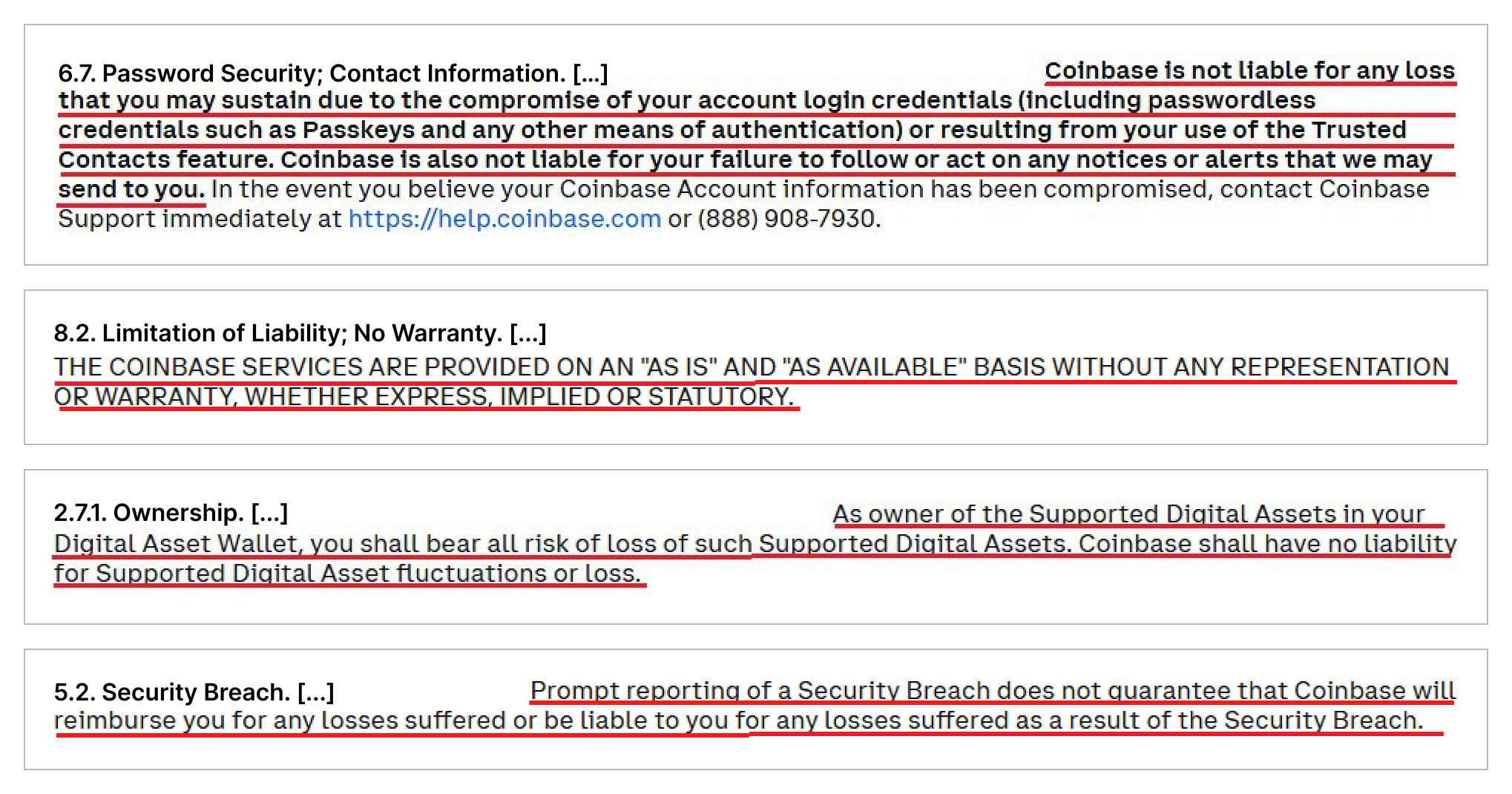 “Coinbase will never […] ask you […] for your passwords, 2-factor codes, or to screen share […] Coinbase is not liable for any loss […] due to the compromise of your account login credentials.” (Section 6.7)